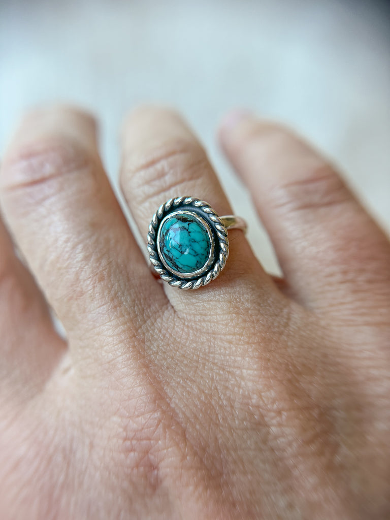 The matrix in this Hubei Turquoise is intricately beautiful! The oval cabochon is accented with twisted Sterling Silver wire and has a dark patina to accent the depth. It's set in a Fine Silver bezel and sits on a half-round Sterling Silver band.