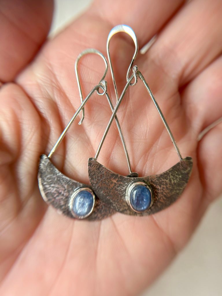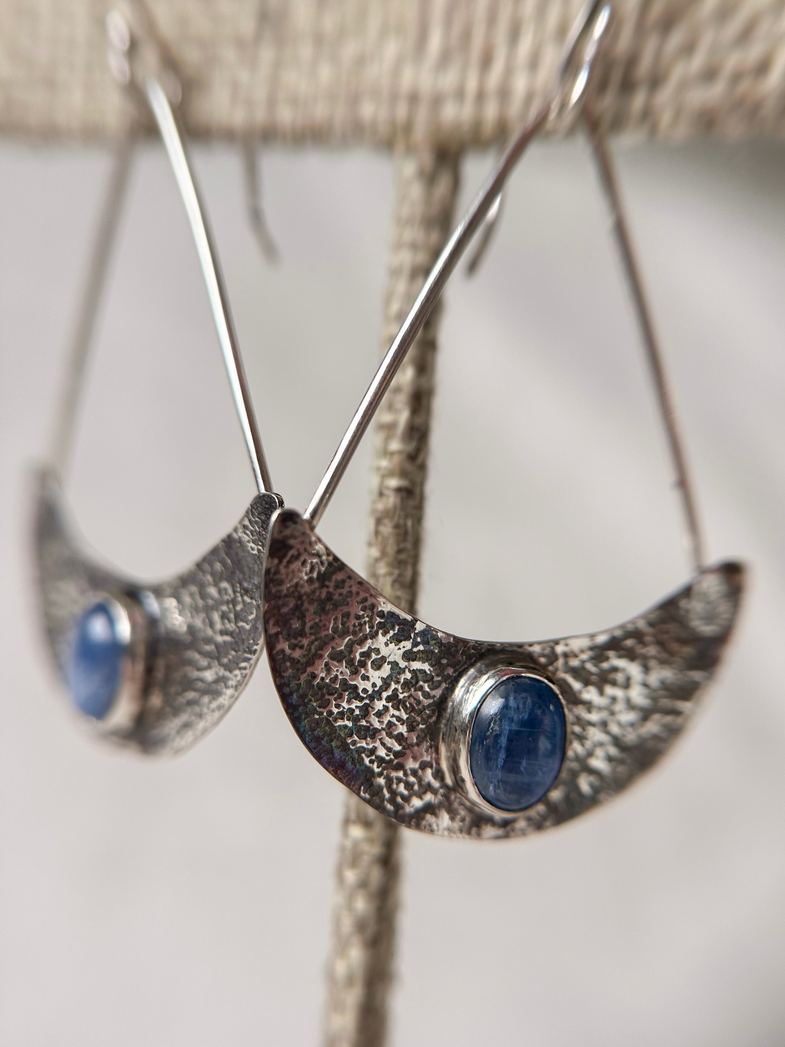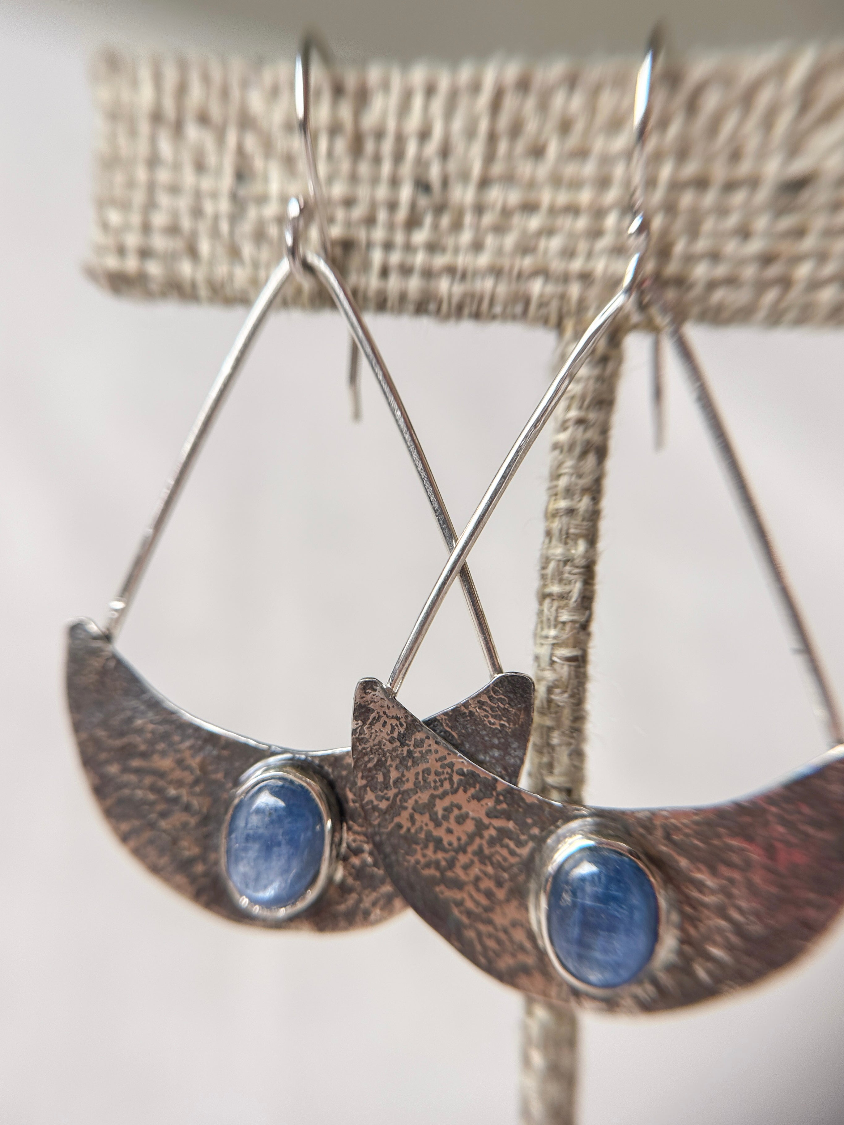 Crescent shaped Sterling Silver earrings feature oval Kyanite cabochons set in Fine Silver shape.  The earring base has an overall hammered texture and patina.  Perfect for date night or your everyday jeans.