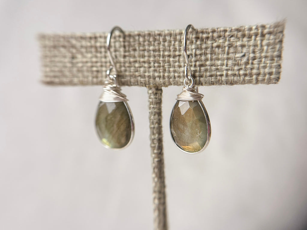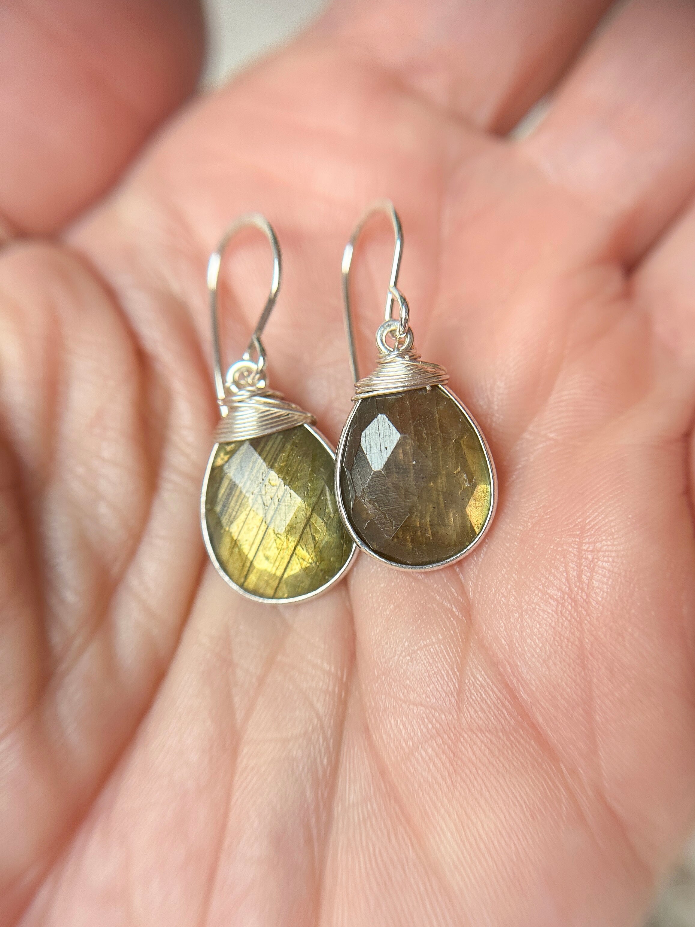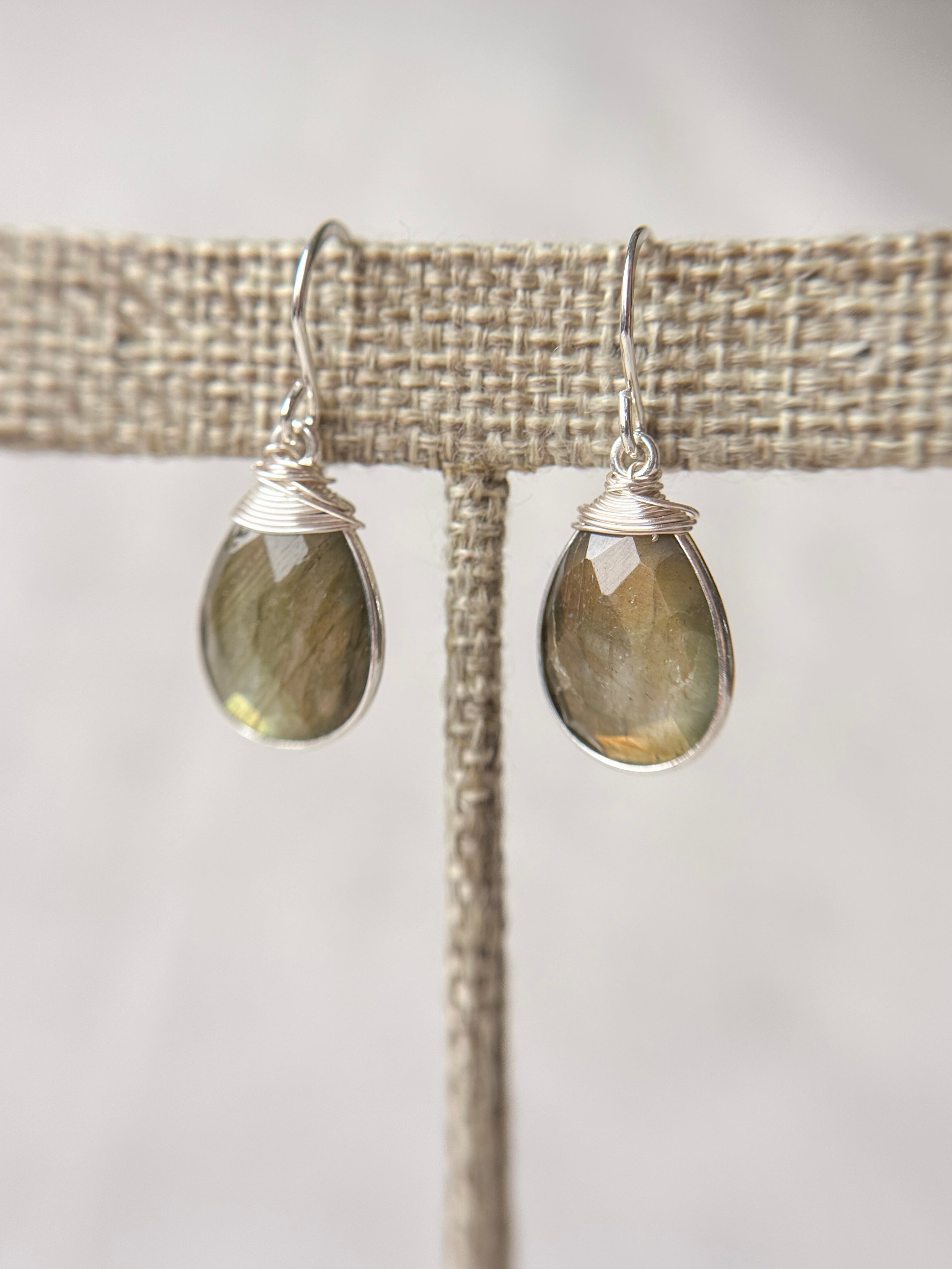 Faceted Labradorite stones are delicately wire wrapped in silver tone wire and hang from Sterling Silver ear wires.  These earrings are perfect for anything from school drop-offs to dinner dates.