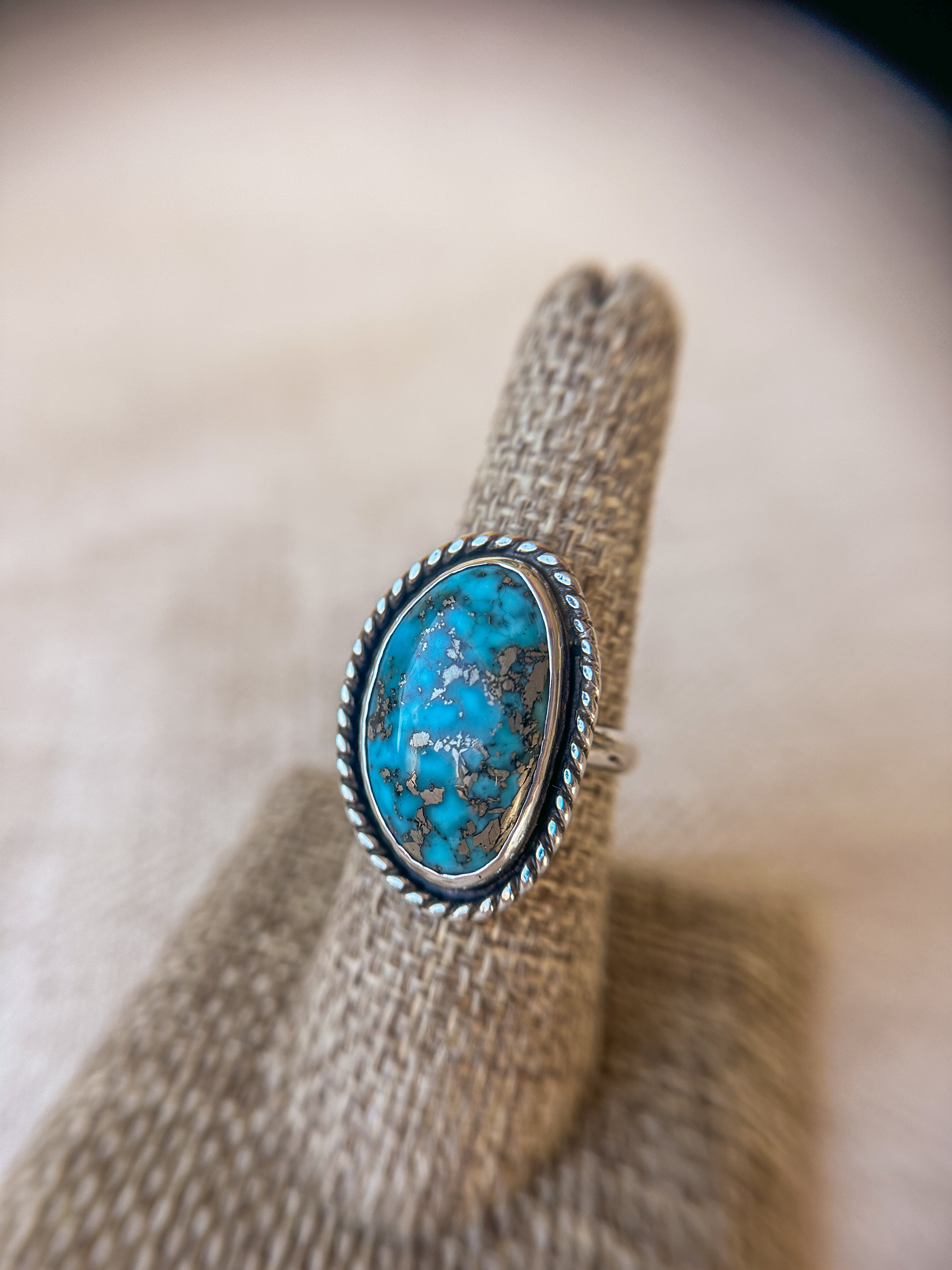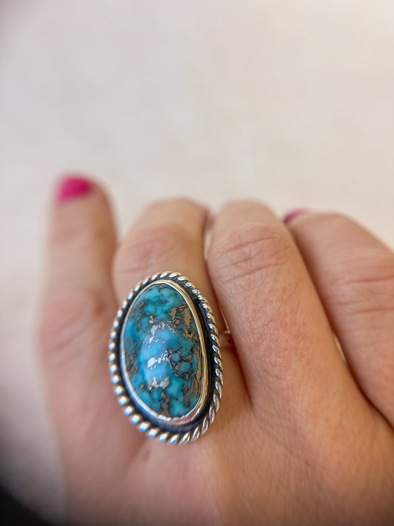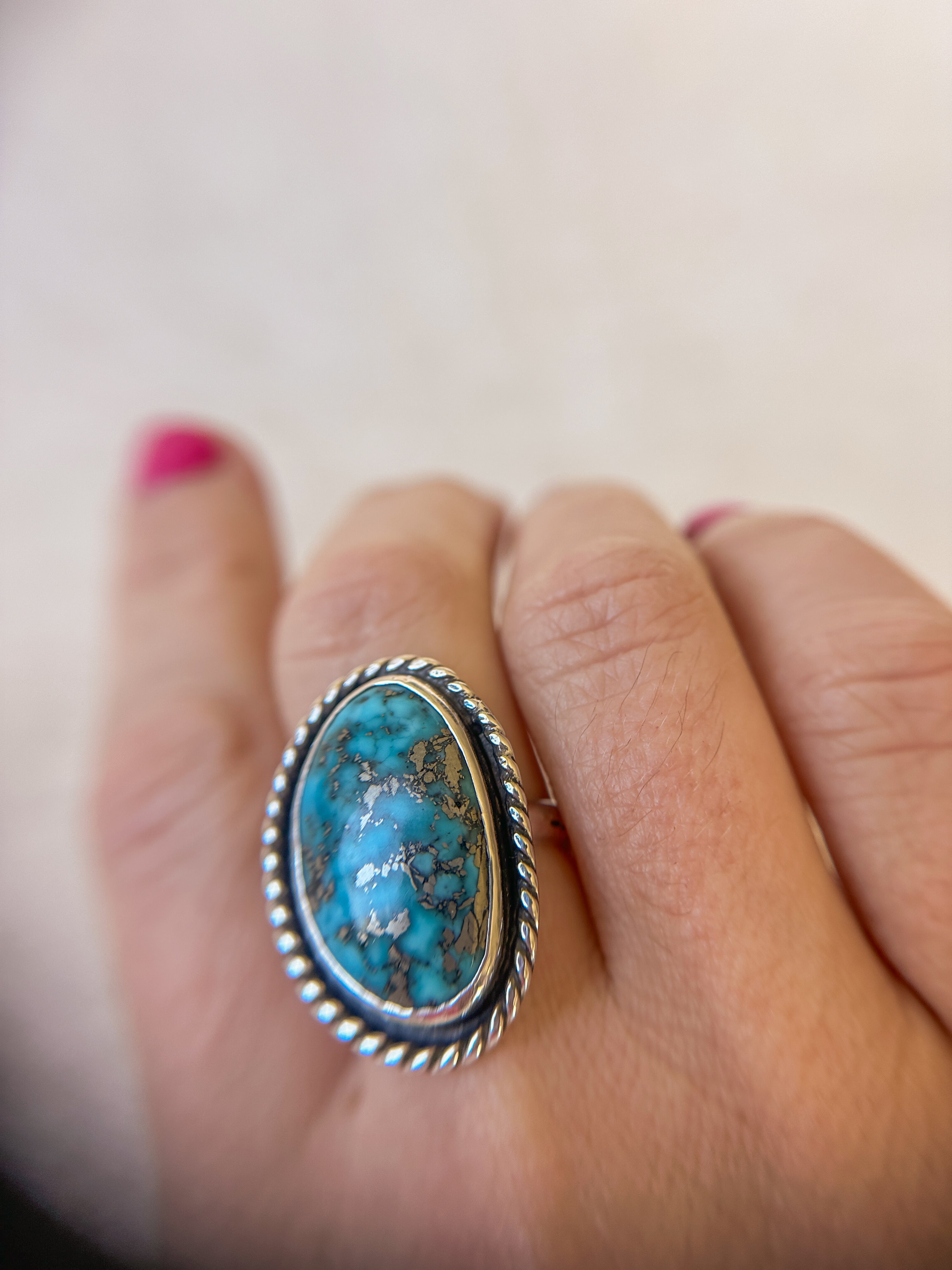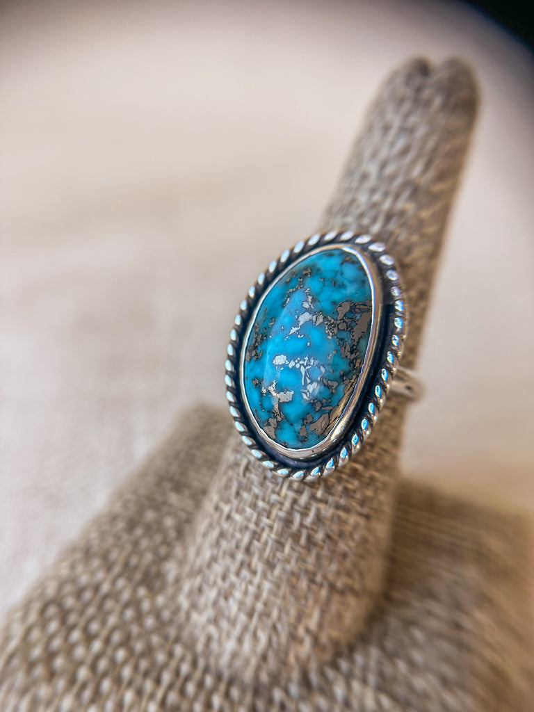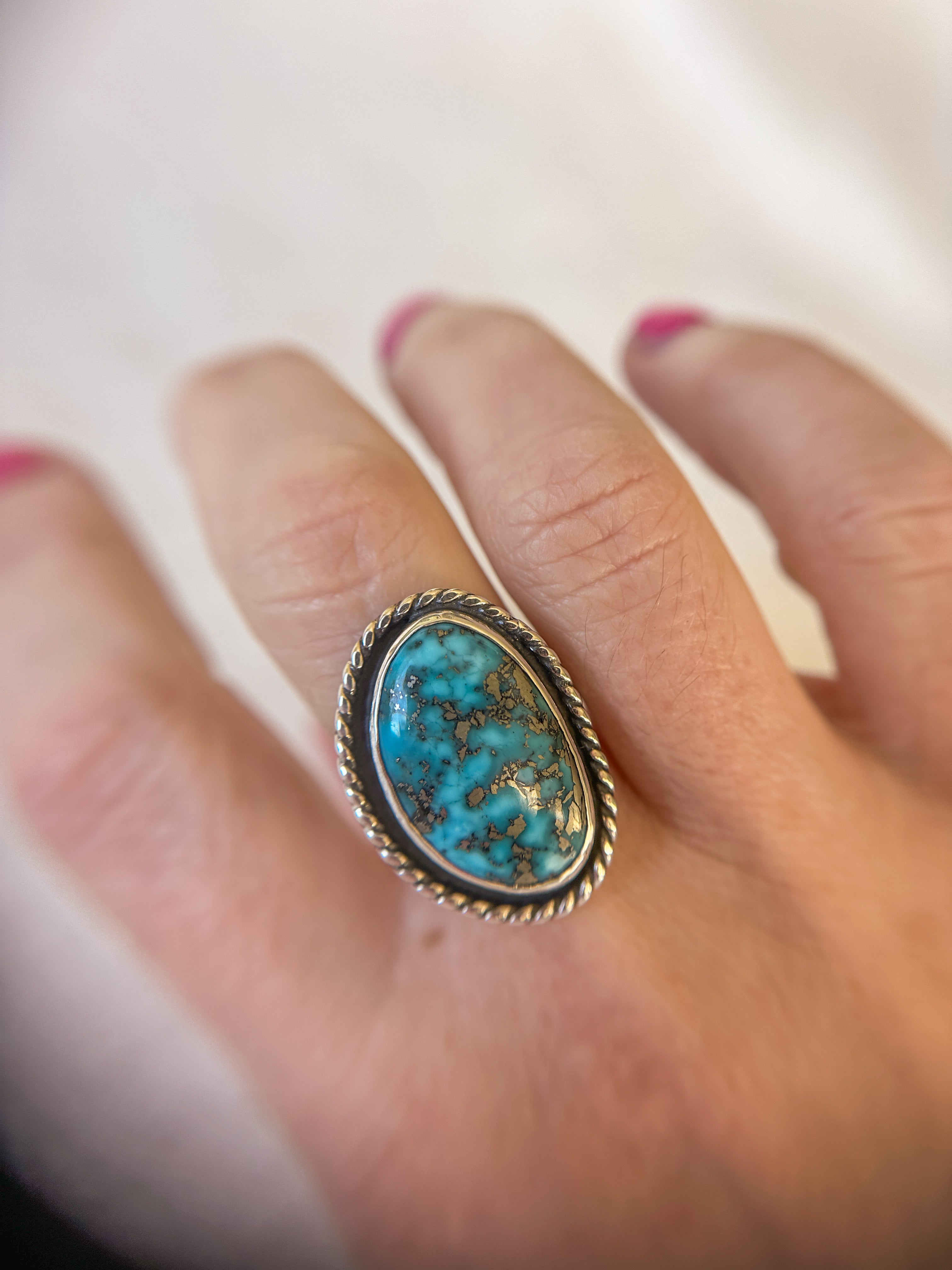 Stunning Persian Turquoise with mottled Pyrite throughout is set in a Fine Silver bezel and flanked with a Sterling Silver Rope design and patina to enhance its depth. Ring shank is half round Sterling Silver. A statement ring for sure!
