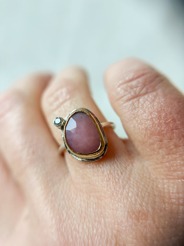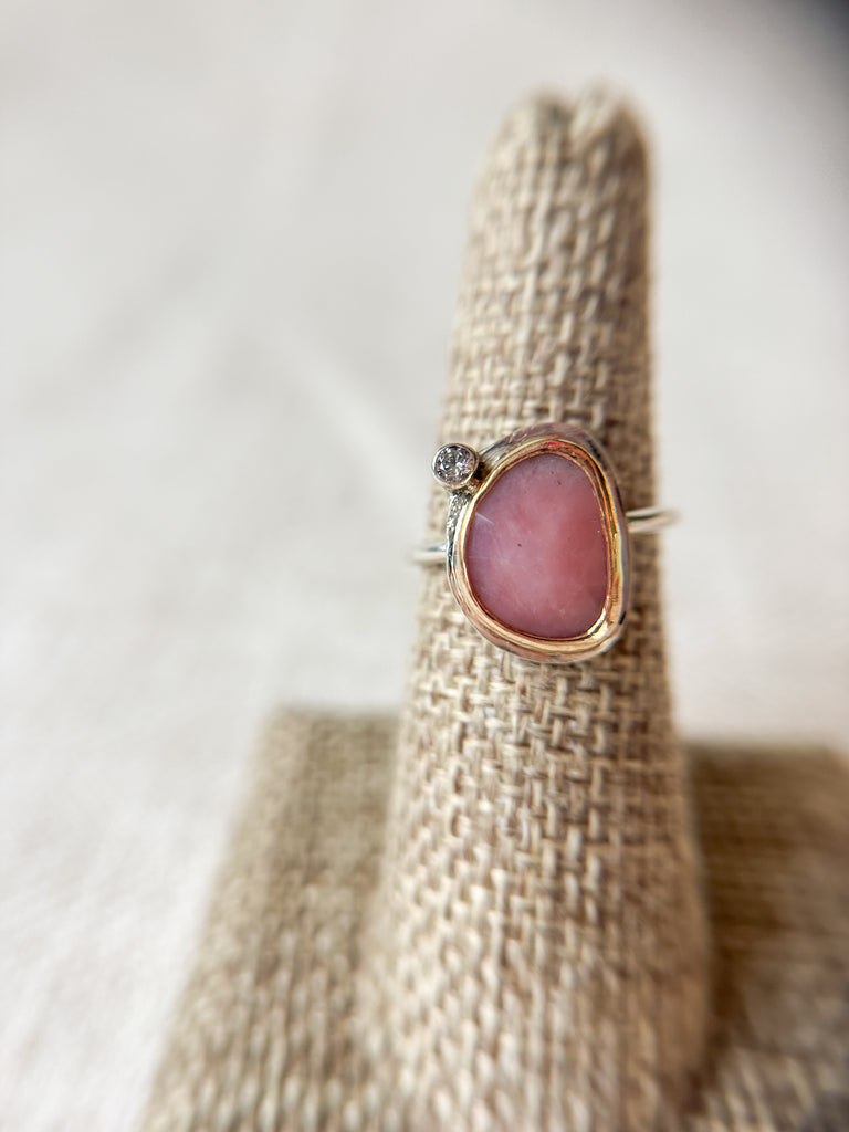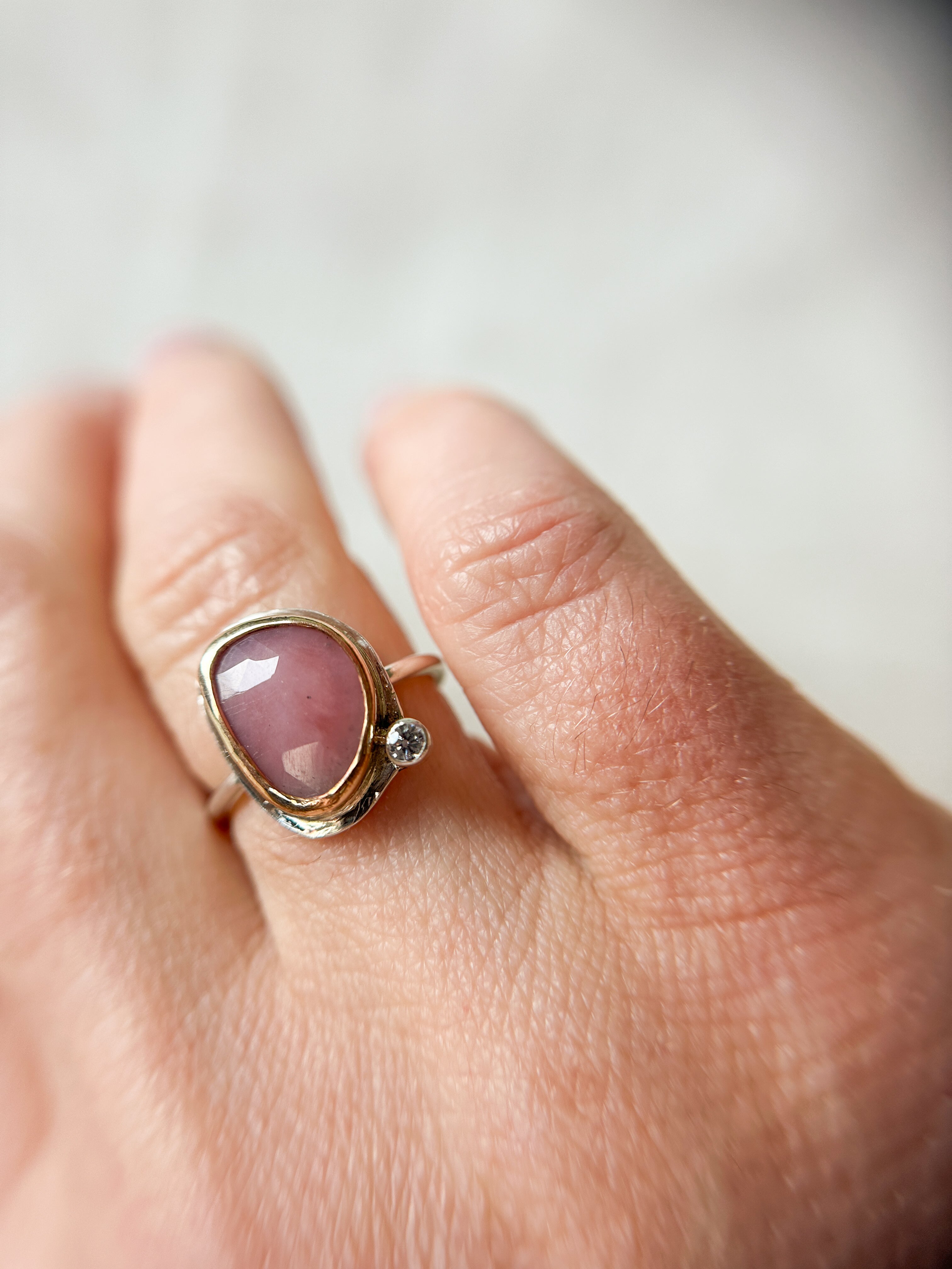 A stunning Pink Opal stunning rosecut cabochon is set in a 14k Gold Fill bezel, set on a Sterling Silver base and flanked with a Sterling Silver set CZ. Ring band is in a delicate Sterling Silver.